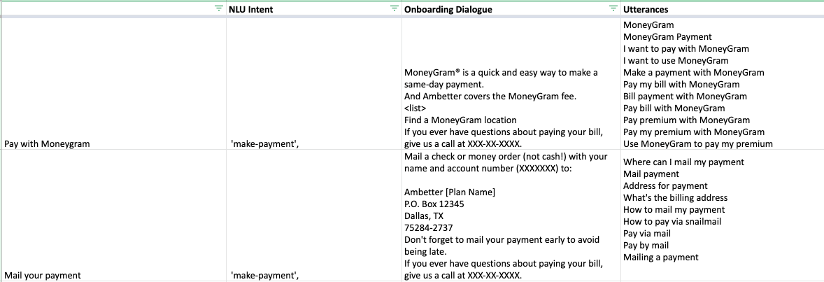 Amber is made up of hundreds of intents. Above is an example of a typical intent-to-utterance analysis and mapping exercise.