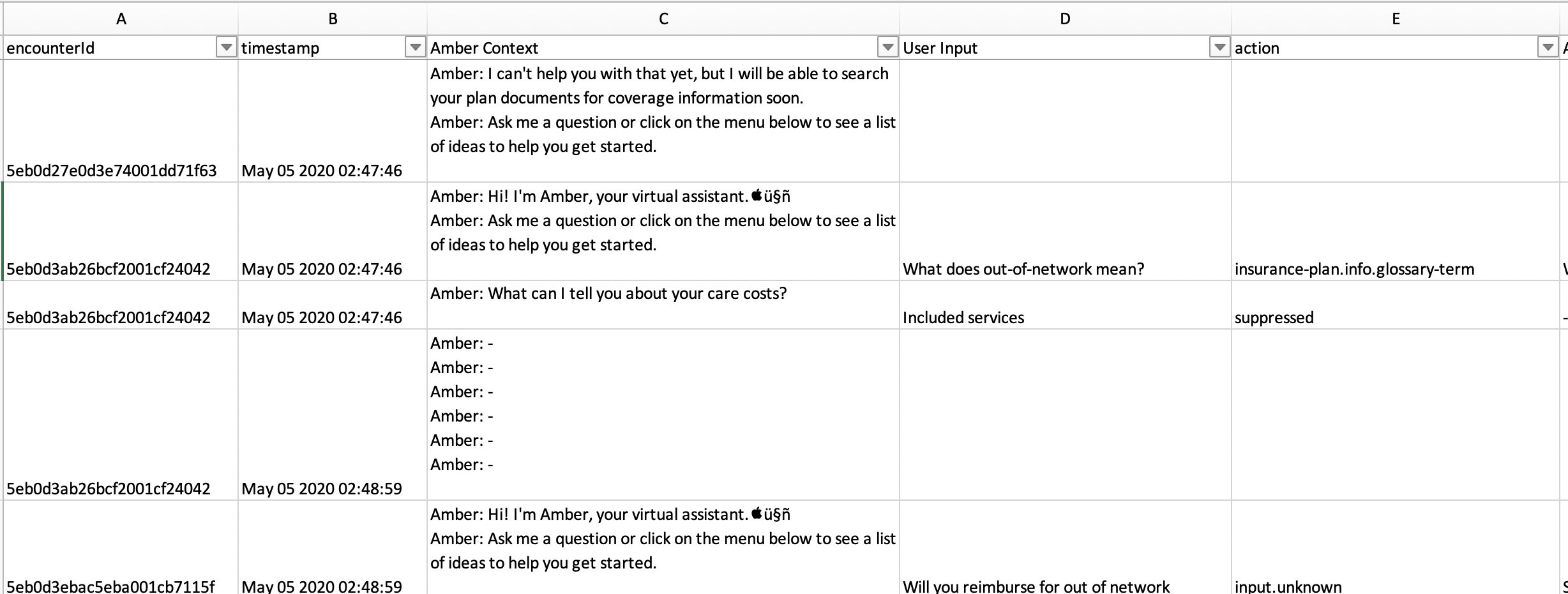 As part of a team, I also participate in post-conversational analysis. We have created an internal tool that downloads over 8,000 conversations with Amber. From this analysis we classify utterances, analyze the intent matched with that utterance for accuracy, assign a success rate, identify topics, and from it build a roadmap of stories Amber must answer in order to become a better virtual assistant. Here’s a sample of that analysis: