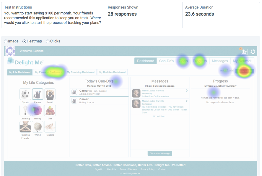 I created this simple click test to measure whether or not users were able to perform a simple task - creating a goal. As you can see, the site is inundated with navigation and options, making it difficult for users to assess where to click. In addition, we learned the terms such as "Can-Do's," "My Life Dashboard," and other terms were unclear to users. It was not clear to users that they were able to be a coach/mentor to someone else as well as monitor their own goals. The bottom row or footer has mixed messages of what a user is supposed to expect from this product. For example, what does "better data" have to do with a user's setting a goal? My recommendation was to get to a point where users have a few tasks that they can do per screen - and only the most important tasks. In other words, Delight Me needed an overhaul of the design and an evaluation of what a minimum viable product should provide, or better yet - go mobile first in order to help assess what the most important features are.