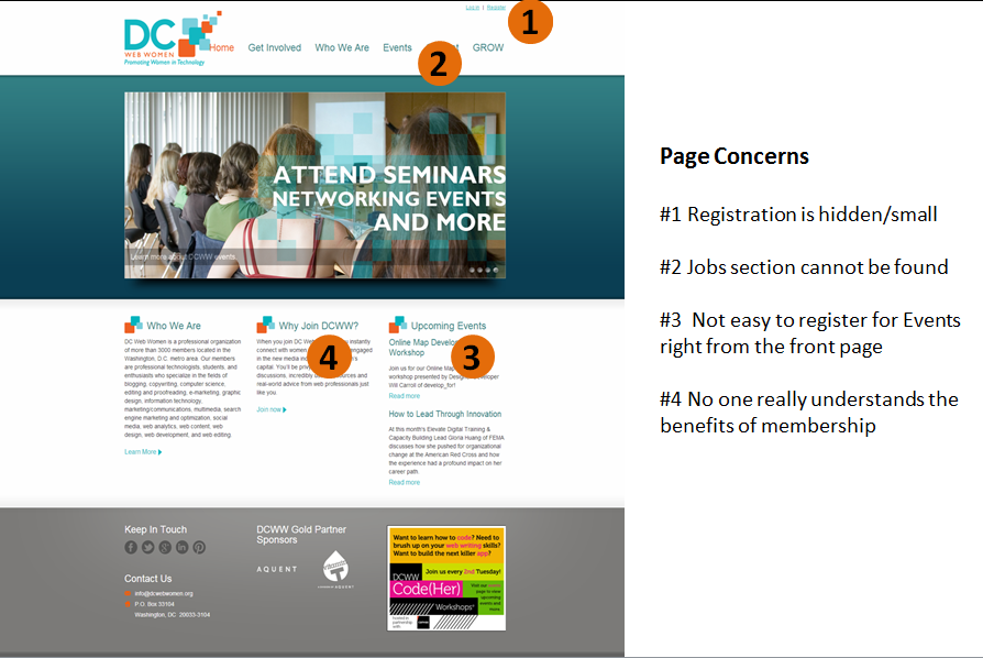 - Required (MVP): Redesign the site so that the top membership priorities are easily found: Jobs, Events, membership perks etc. Improve the placement of registration buttons.