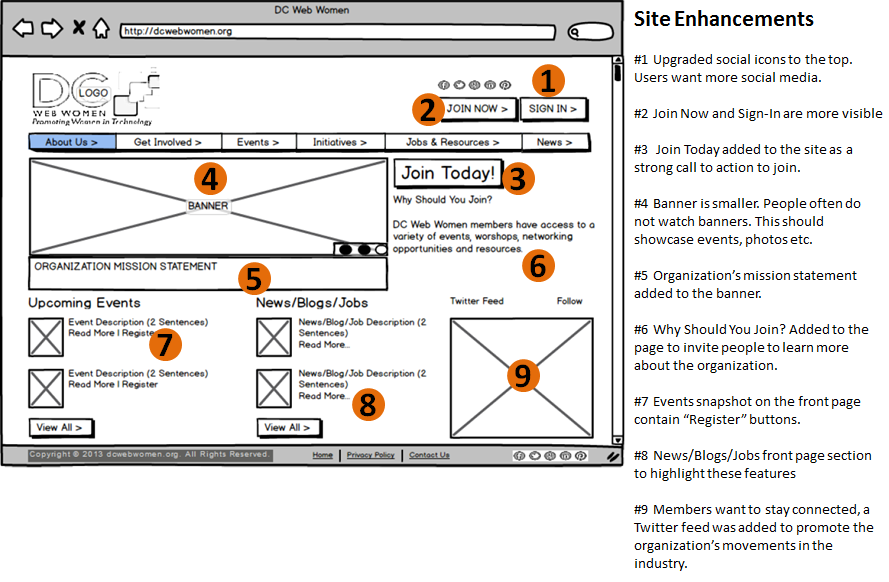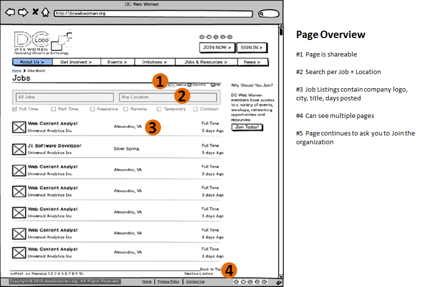 DCWebWomen.org does not currently have a jobs page, but the site is built in Wordpress. This wireframe includes features that are easily found in Wordpress widgets.