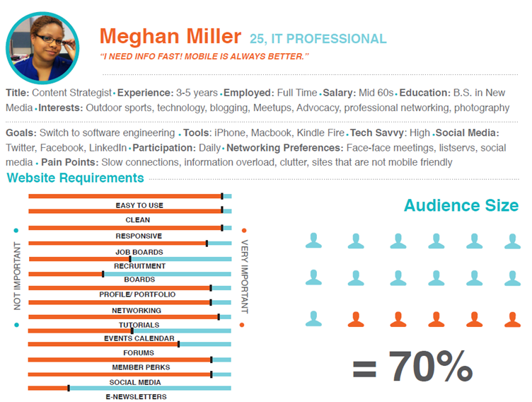 Sample persona created for the top audience for DCWebWomen.org. The majority of members are women ages 18-35, with intermediate skills, currently employed or looking for work in the Washington D.C. metro area. Personas were created by Crystal Augusto (great Illustrator skills) based on research.