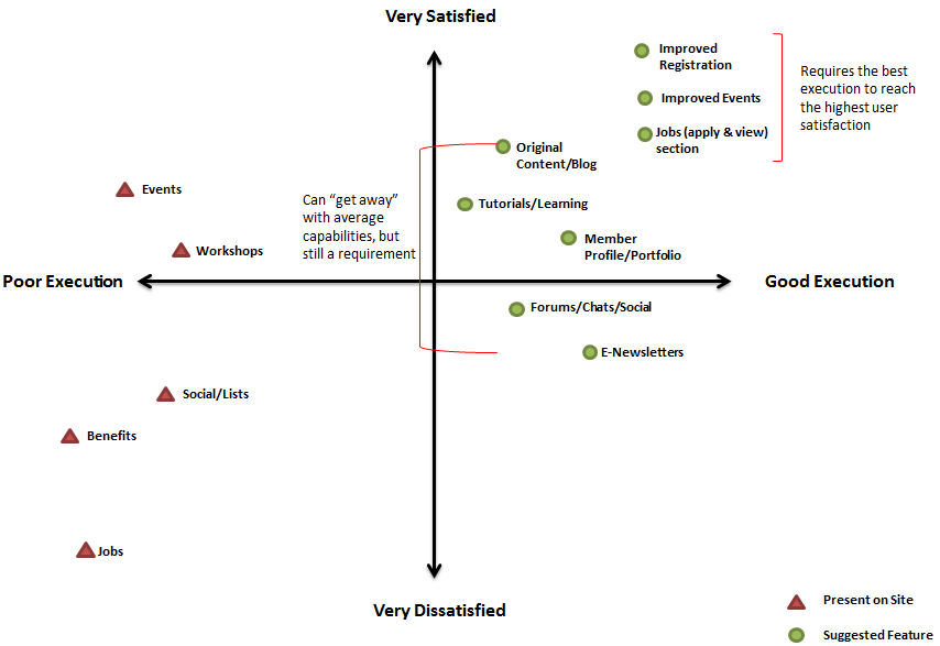 I played around a bit with the concept of Kano Analysis. My aim was to examine the most on-demand website features that survey respondents mentioned, and plot them on a line of most importance, but also of highest execution requirements.